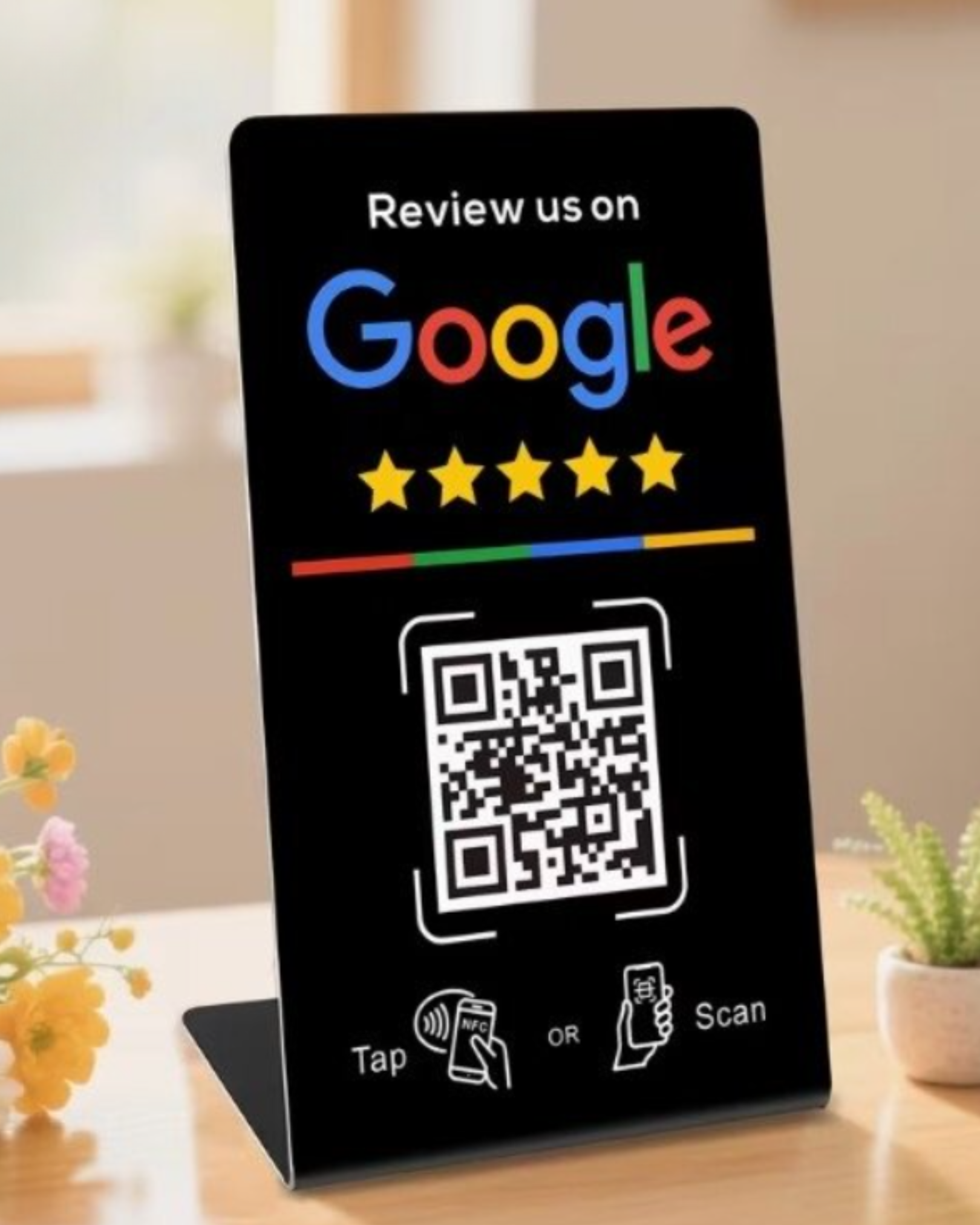 Plaats het product op een zichtbare plek en laat gasten hun telefoon ertegenaan houden OF de QR code scannen. Ze worden direct doorgestuurd naar de reviewpagina – laagdrempelig, snel en effectief.